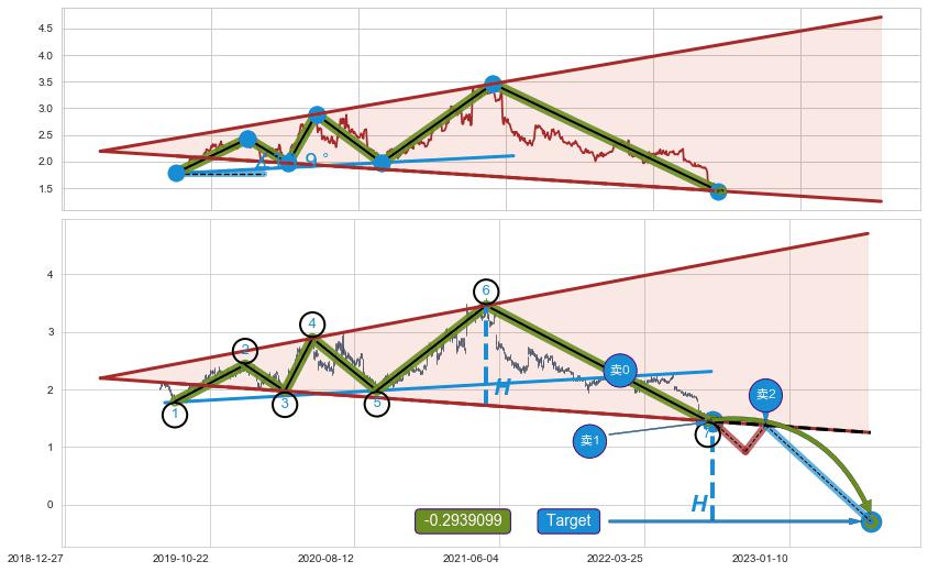 ➢ 最小反转跌幅→𝐇: 1.7375 (逐步抬高阻力斜边最后的阻力点⑥与支撑边垂直距离)