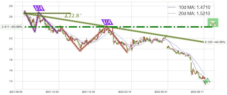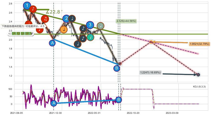♘ 在最后的下跌阶段2021-08-09至2022-08-12,存在 持续未破位的阻力位 ,阻力价格2.125,可信任强度88.63%,其距离最后价格1.4700相差 +44.58%