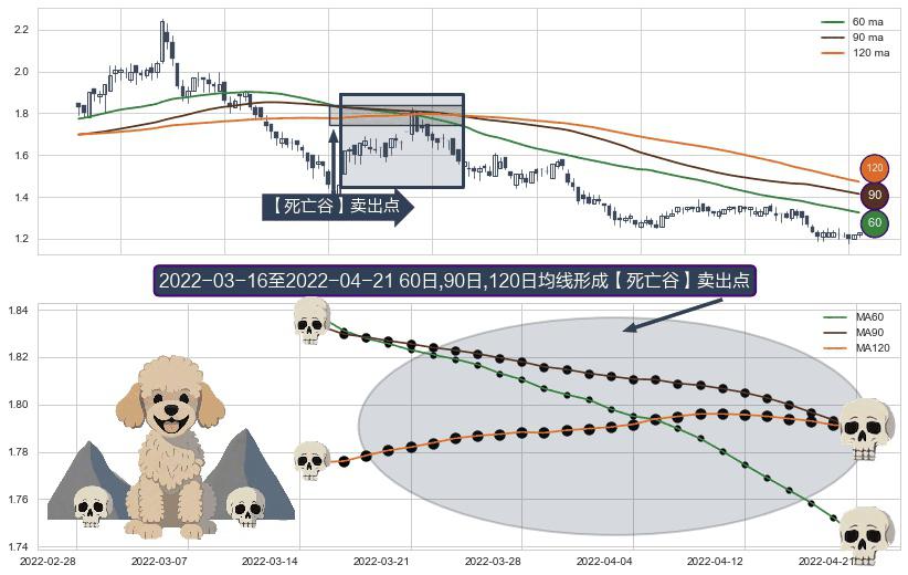 形态多维评估: ⚀ 2022-03-17-日至2022-04-21-日显现 60日-90日-120日均线 【死亡谷】卖出点 看空信号,后市看跌,卖出