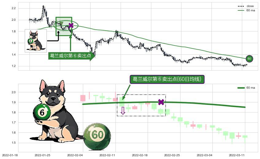 形态多维评估: ⚀ 2022-02-14-日显现 葛兰威尔均线 60日均线 第⑥卖出点 走势反转见顶信号,后市看跌,卖出信号