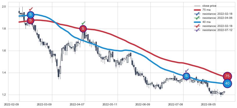 下跌趋势2022-02-09-2022-08-12,均线40, 75确认关键阻力3处