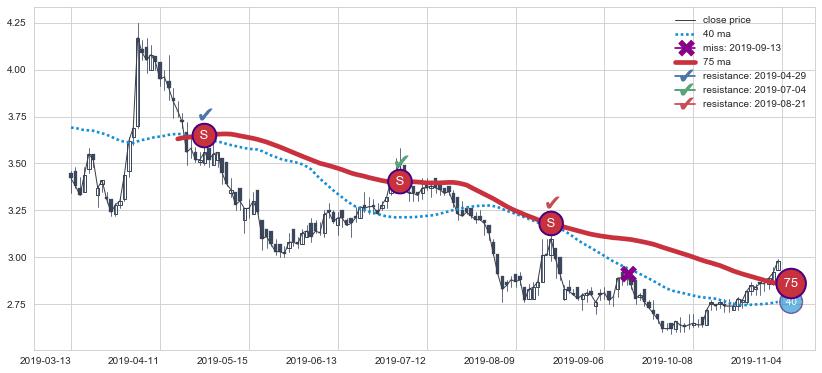 下跌趋势2019-03-13-2019-11-04,均线75确认关键阻力3处