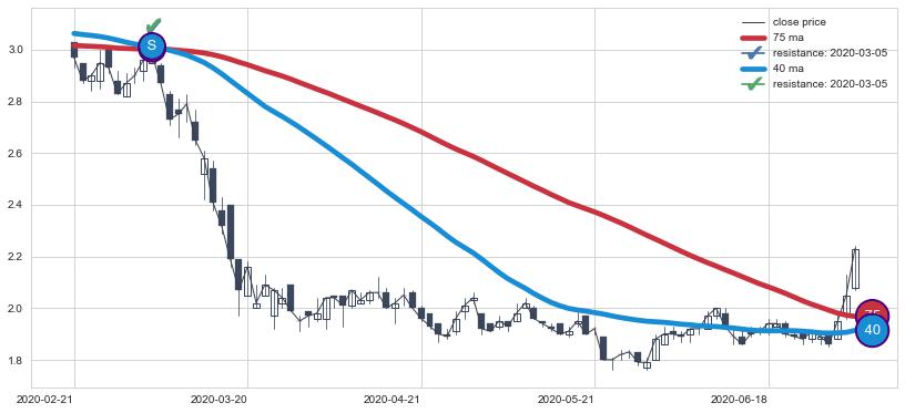 下跌趋势2020-02-21-2020-07-06,均线40, 75确认关键阻力1处