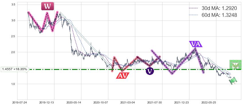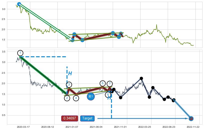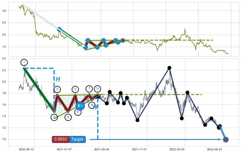 ➣ D点拟合预测价格2.678,距离最后交易收盘价格1.2300相差 +117.72%