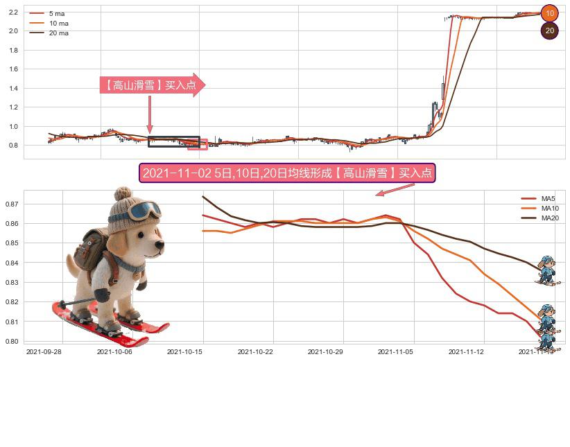 形态多维评估: ⚀ 2021-10-15日-2021-11-18日显现 5日-10日-20日均线 【高山滑雪】买入点 看多信号,后市看涨,买入