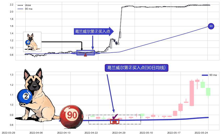 形态多维评估: ⚀ 2022-04-27-日显现 葛兰威尔均线 90日均线 第②买入点 上升趋势的中继信号,后市看涨,买进信号