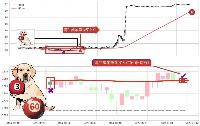 形态多维评估: ⚀ 2022-04-01-日显现 葛兰威尔均线 60日均线 第③买入点 上升趋势的中继信号,后市看涨,买进信号