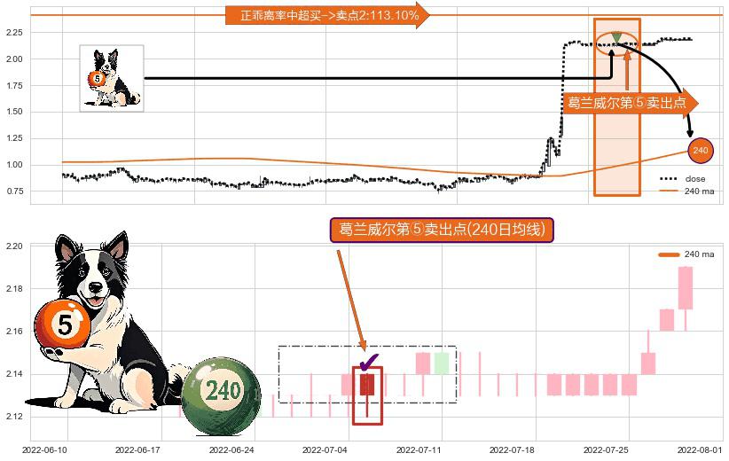 形态多维评估: ⚀ 2022-07-05-日显现 葛兰威尔均线 240日均线 第⑤卖出点 上升趋势均值回复的短线回落信号,后市看跌,卖出信号
