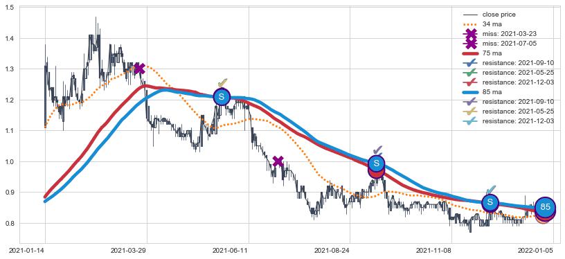 下跌趋势2021-01-14-2022-01-05,均线75, 85确认关键阻力3处