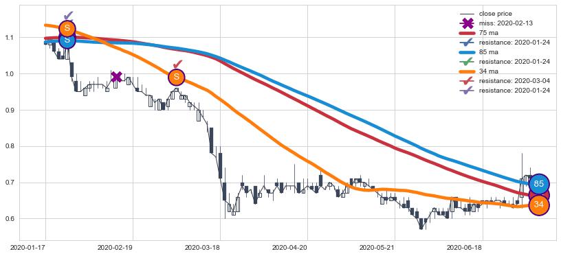 下跌趋势2020-01-17-2020-07-07,均线34, 75, 85确认关键阻力2处