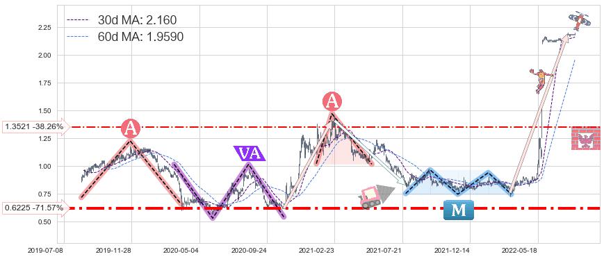 ♘ 支撑价格位0.6225,可信任强度77.36%,距离最后交易2022-08-12形成的收盘价格2.190相差 -71.57%