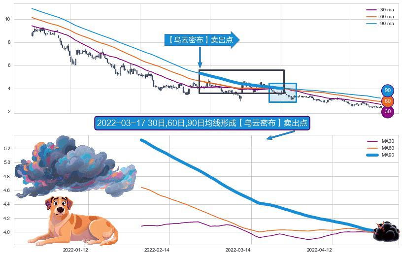 ⚀ 2022-01-31日-2022-05-03日显现 30日-60日-90日均线 【乌云密布】卖出点 看空信号,后市看跌,卖出
