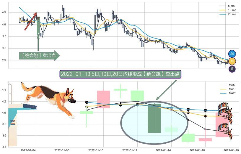 ⚀ 2022-01-13日显现 5日-10日-20日均线 【绝命跳】卖出点 看空信号,后市看跌,卖出