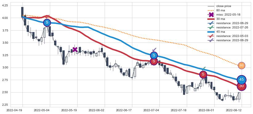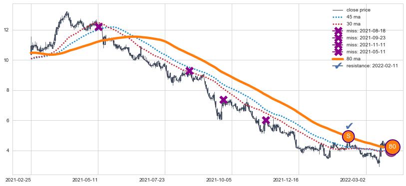 ⚂ 2022-03-18-日均线向上突破,2022-04-19-日重新下穿均线破位,均线阻力再次生效