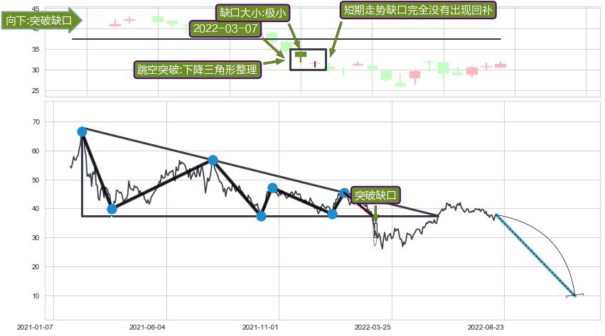 ➢ 【多方力量耗尽,空方打破攻守平衡点】下降三角形中继整理, 已在2022-03-02突破【支撑】颈线 37.50 →演变成下降通道