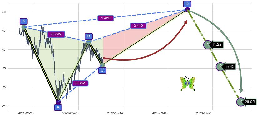 ➣ 未完成【蝴蝶】形态起点X: 2021-11-22, 已到达C点: 2022-08-10, 预测最终D点: 2023-05-04, 共368交易日