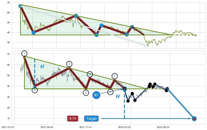 | 4 🅚:【断头铡刀】卖出点 ➕ 📐:下降三角整理下行突破支撑位破位, 猜想持续下沉下跌,被突破的支撑位已变为阻力位 ☞ 看空信号 ⇥ 【均线】交织【图形】⇥ 综合量化分数: 34 | > |