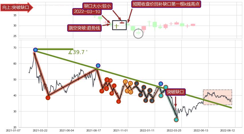 ➣ 突破缺口形成后,后续k已经超过14根,跳空突破趋势线关键点后, 出现【完全回踩】迹象,短期收盘价回补缺口第一根k线高点
