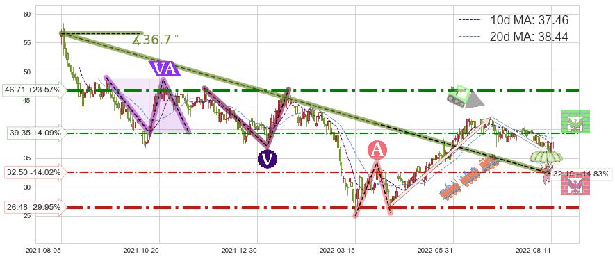 ♘ 支撑价格位32.50,可信任强度52.45%,距离最后交易2022-08-12形成的收盘价格37.80相差 -14.02%