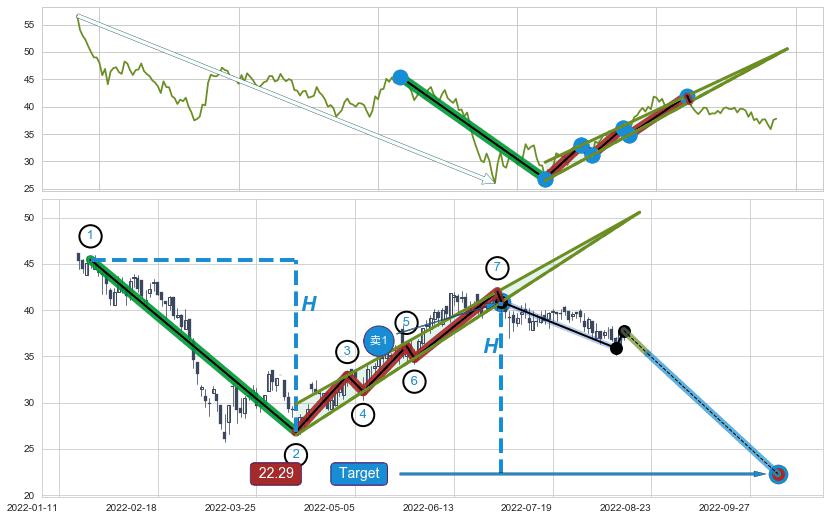 | 3 🅚:上探下跌 ➕ 📐:升楔型下行突破支撑位破位, 猜想持续下沉下跌,被突破的支撑位已变为阻力位 ☞ 看空信号 ⇥ 【🅚线】交织【图形】⇥ 综合量化分数: 42 | > |