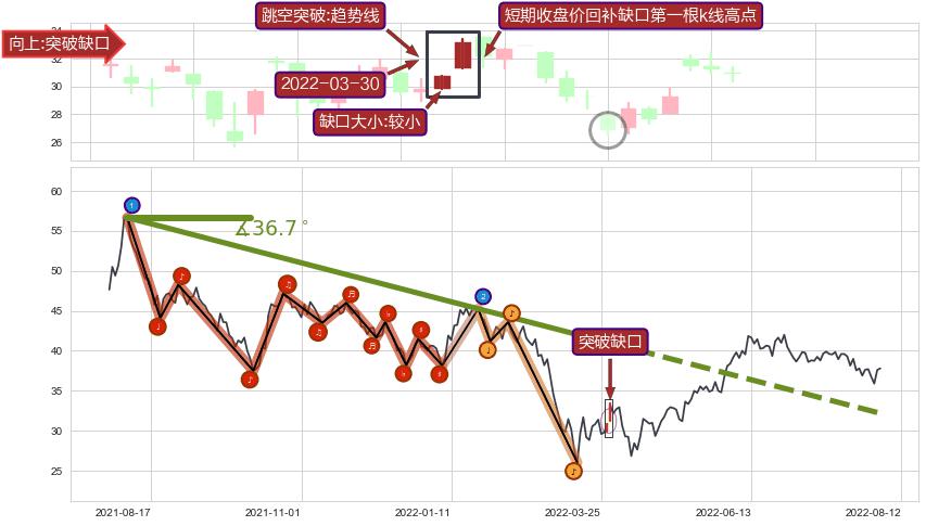 ➢ 2021-08-05-2022-03-29下跌趋势存在反转上涨[机会],其原下跌趋势的阻力位(32.19)已被突破[强支撑信号],原下跌趋势角度: 36.7˚