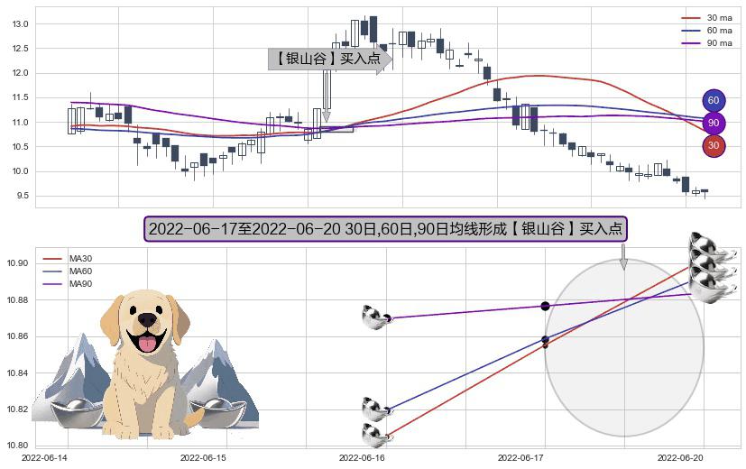 形态多维评估: ⚀ 2022-06-20-日至2022-06-20-日显现 30日-60日-90日均线 【银山谷】买入点 看多信号,后市看涨,买入