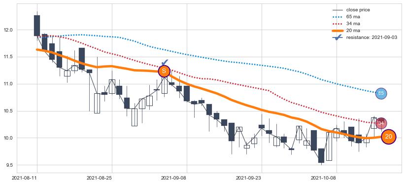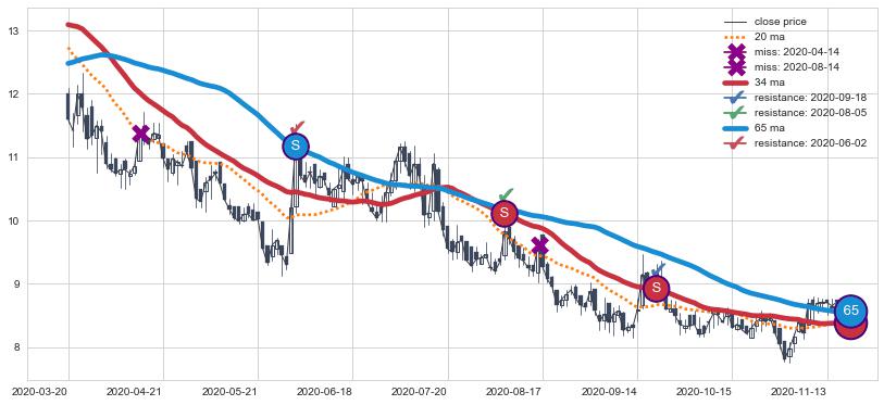 下跌趋势2020-03-20-2020-11-17,均线65, 34确认关键阻力3处