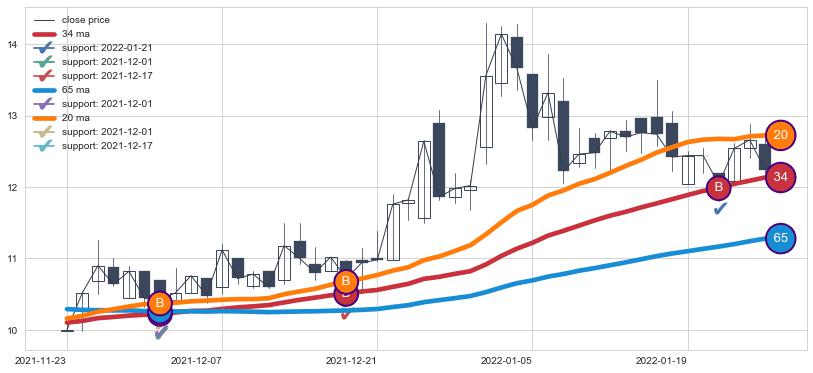 上涨趋势2021-11-23-2022-01-26,均线65, 34, 20确认关键支撑3处