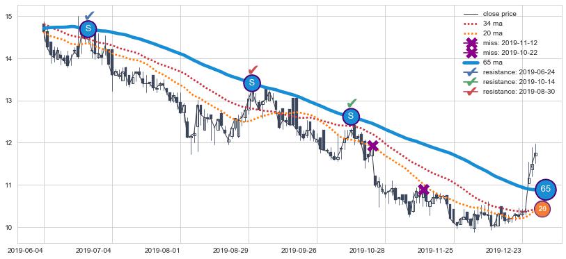 下跌趋势2019-06-04-2019-12-31,均线65确认关键阻力3处