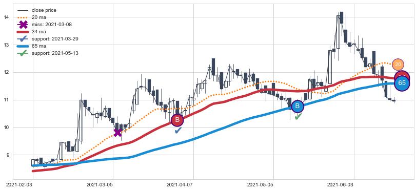 上涨趋势2021-02-03-2021-06-18,均线65, 34确认关键支撑2处
