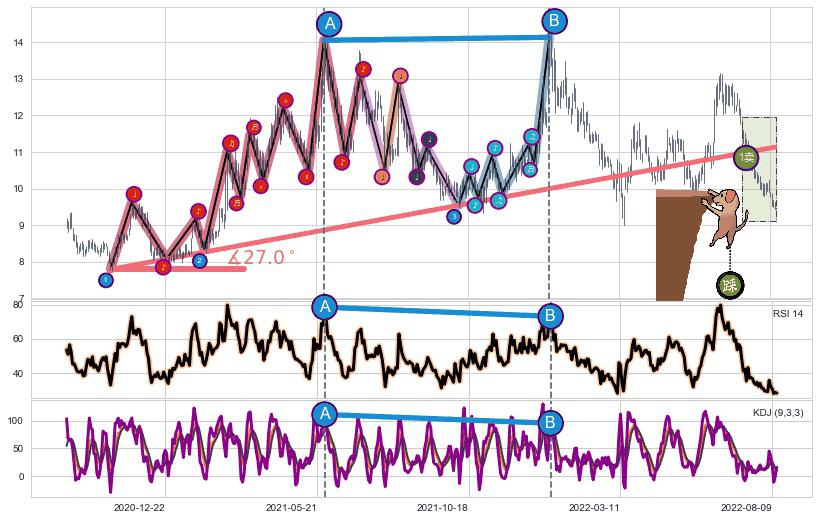 ✂️ 2020-11-02-2022-03-04上升趋势存在反转[风险],其原上升趋势的支撑位(11.13)已破位[强阻力信号],原上升趋势角度: 27.0˚