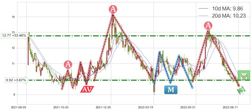 ♘ 阻力价格位9.92,可信任强度67.48%,距离最后交易2022-08-12形成的收盘价格9.57相差 +3.67%