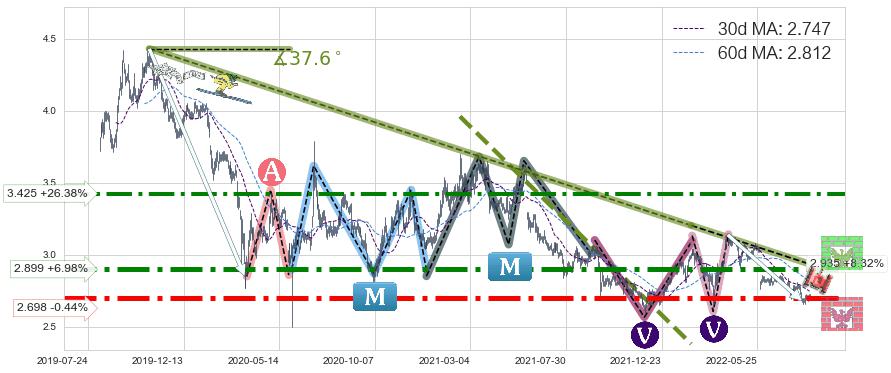 ♘ 阻力价格位2.899,可信任强度85.28%,距离最后交易2022-08-12形成的收盘价格2.710相差 +6.98%