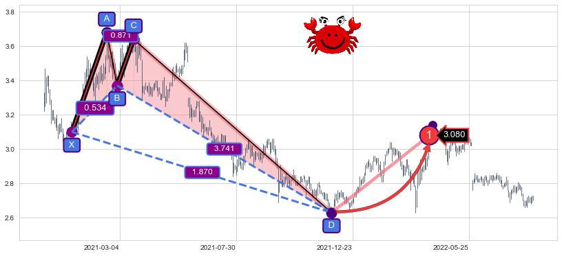 | 13 🅚:【蛟龙出海】买入点 ➕ 📡:谐波螃蟹已到达d点:猜想c下行到达d点后报复性拉升上涨(均值回复) ☞ 看多信号 ⇥ 【均线】交织【图形】⇥ 综合量化分数: 53 | > |