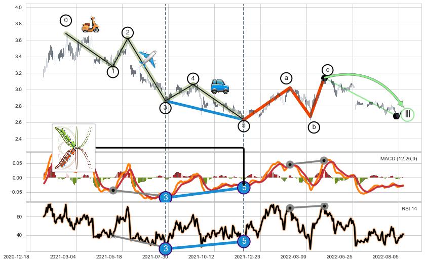 ➣ a,c调整浪MACD, RSI, KDJ走势都【未出现】背离,abc走势延续, 5浪反转概率增强