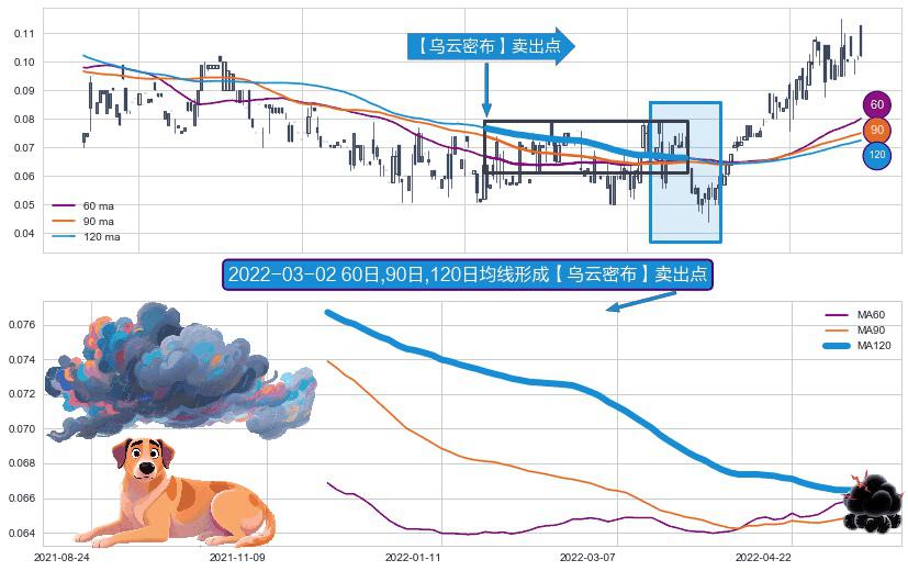 ⚀ 2021-12-01日-2022-05-05日显现 60日-90日-120日均线 【乌云密布】卖出点 看空信号,后市看跌,卖出