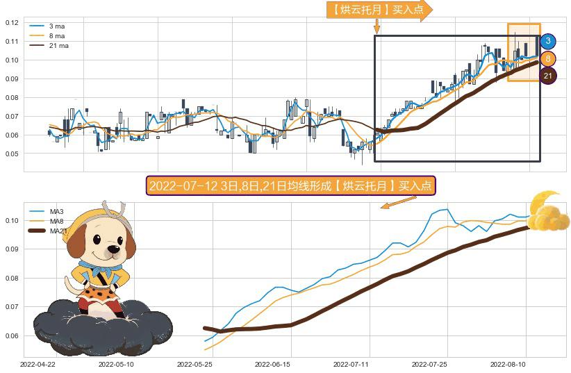 ⚀ 2022-05-23日-2022-08-12日显现 3日-8日-21日均线 【烘云托月】买入点 看多信号,后市看涨,买入
