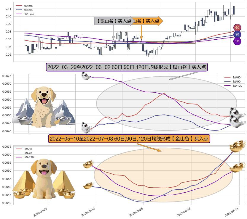 ⚃ 2022-05-11-日至2022-07-08-日显现 60日-90日-120日均线 【金山谷】买入点 其再次确认了买入信号,可靠性更强,买入