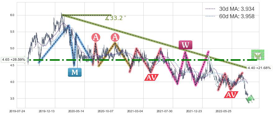 ➢ 【多方力量耗尽,空方打破攻守平衡点】下降三角形中继整理, 已在2021-07-27突破【支撑】颈线 4.33 →演变成下降通道