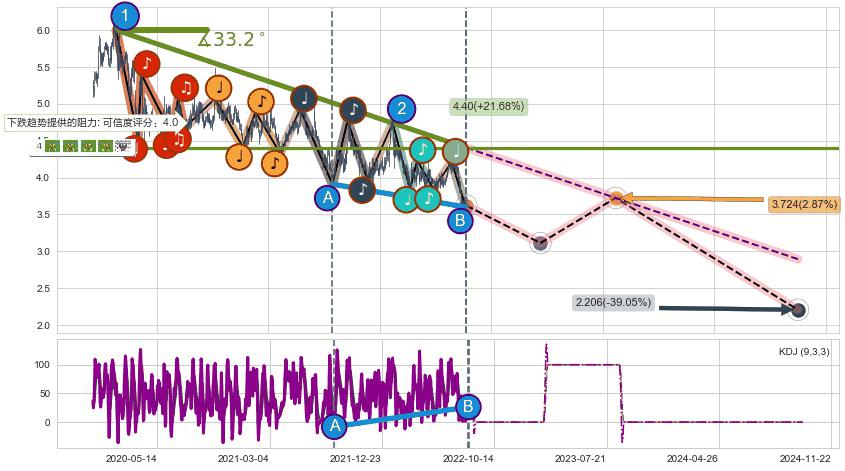 ♘ 在最后的下跌阶段2020-01-24至2022-08-12,存在 持续未破位的阻力位 ,阻力价格4.40,可信任强度84.82%,其距离最后价格3.620相差 +21.68%