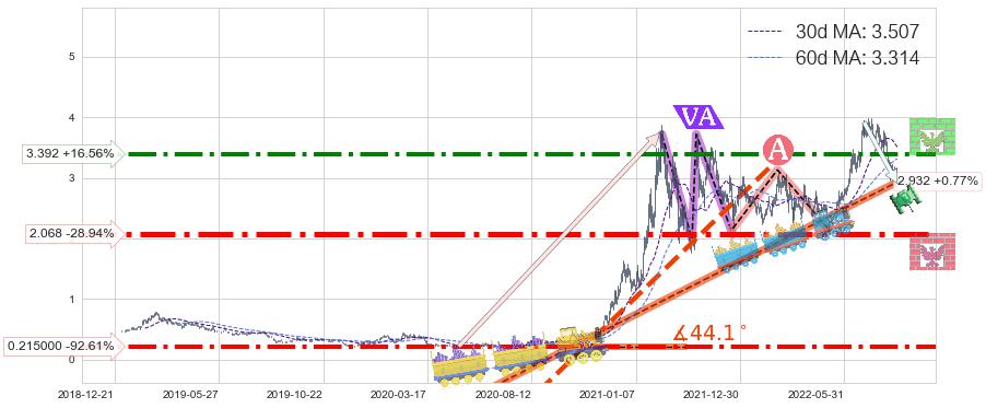 ♘ 阻力价格位3.392,可信任强度76.02%,距离最后交易2022-08-12形成的收盘价格2.910相差 +16.56%