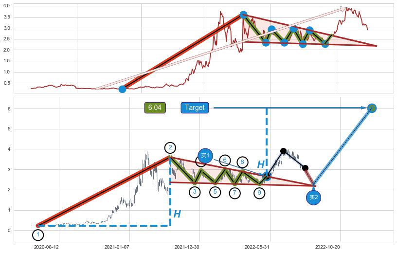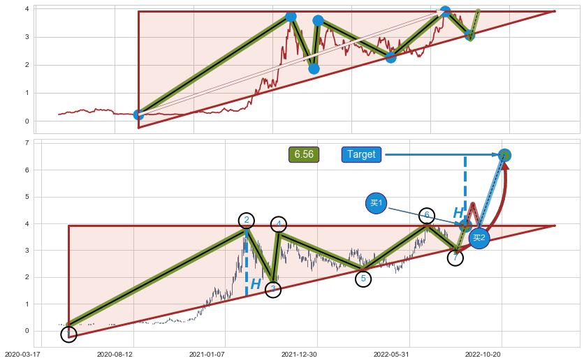 ➢ 最小中继整理涨幅→𝐇: 3.381 (𝐇楔型旗杆的长度:楔型起点→顶点)