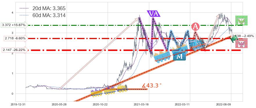 ♘ 阻力价格位3.372,可信任强度64.92%,距离最后交易2022-08-12形成的收盘价格2.910相差 +15.87%