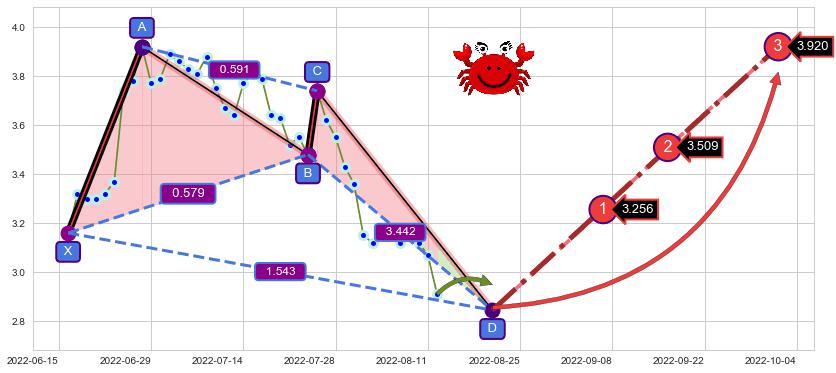 ➣ 未完成【螃蟹】形态起点X: 2022-06-16, 已到达C点: 2022-07-26, 预测最终D点: 2022-08-22, 共47交易日