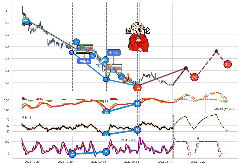 ➣ 【中枢B】:2022-03-23-2022-04-06,中枢由5笔构成,共10交易日, ZG=0.5200, ZD=0.5200