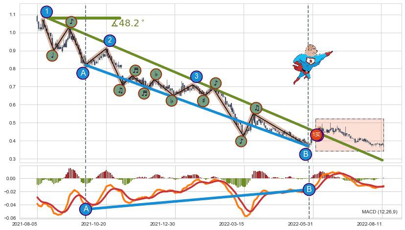 ➣ 【MACD】下跌趋势出现【常规背离 & 反转信号】背离程度44.14%,背离夹角角度68.8˚,背离程度较大