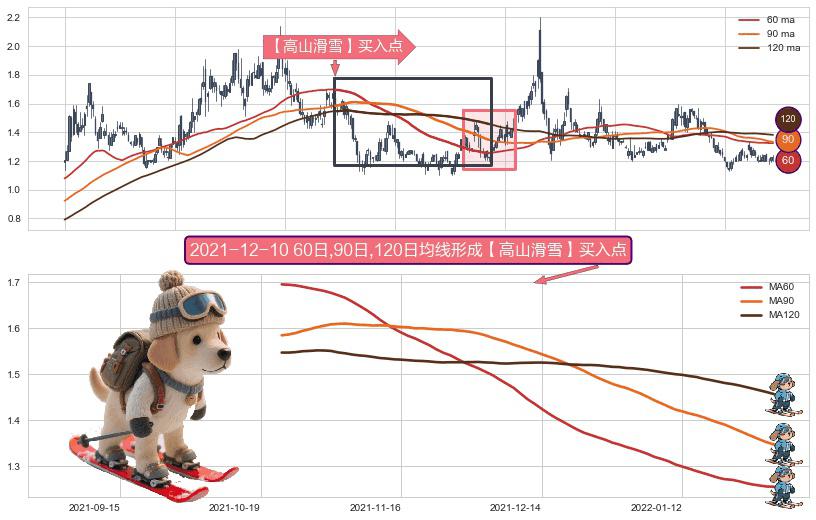 ⚀ 2021-10-22日-2022-01-31日显现 60日-90日-120日均线 【高山滑雪】买入点 看多信号,后市看涨,买入