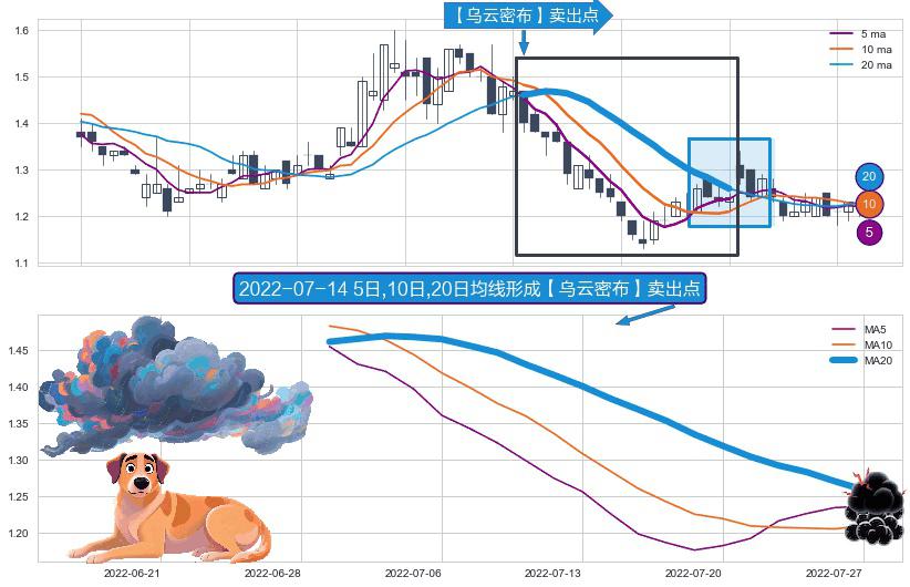 ⚀ 2022-06-29日-2022-07-27日显现 5日-10日-20日均线 【乌云密布】卖出点 看空信号,后市看跌,卖出