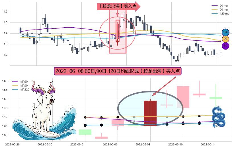 ⚀ 2022-06-08日显现 60日-90日-120日均线 【蛟龙出海】买入点 看多信号,后市看涨,买入
