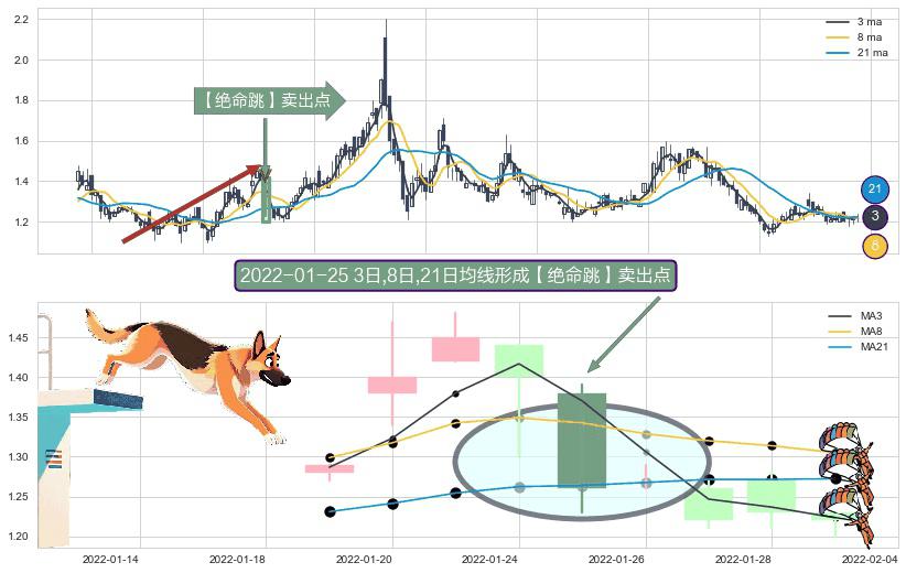 ⚀ 2022-01-25日显现 3日-8日-21日均线 【绝命跳】卖出点 看空信号,后市看跌,卖出